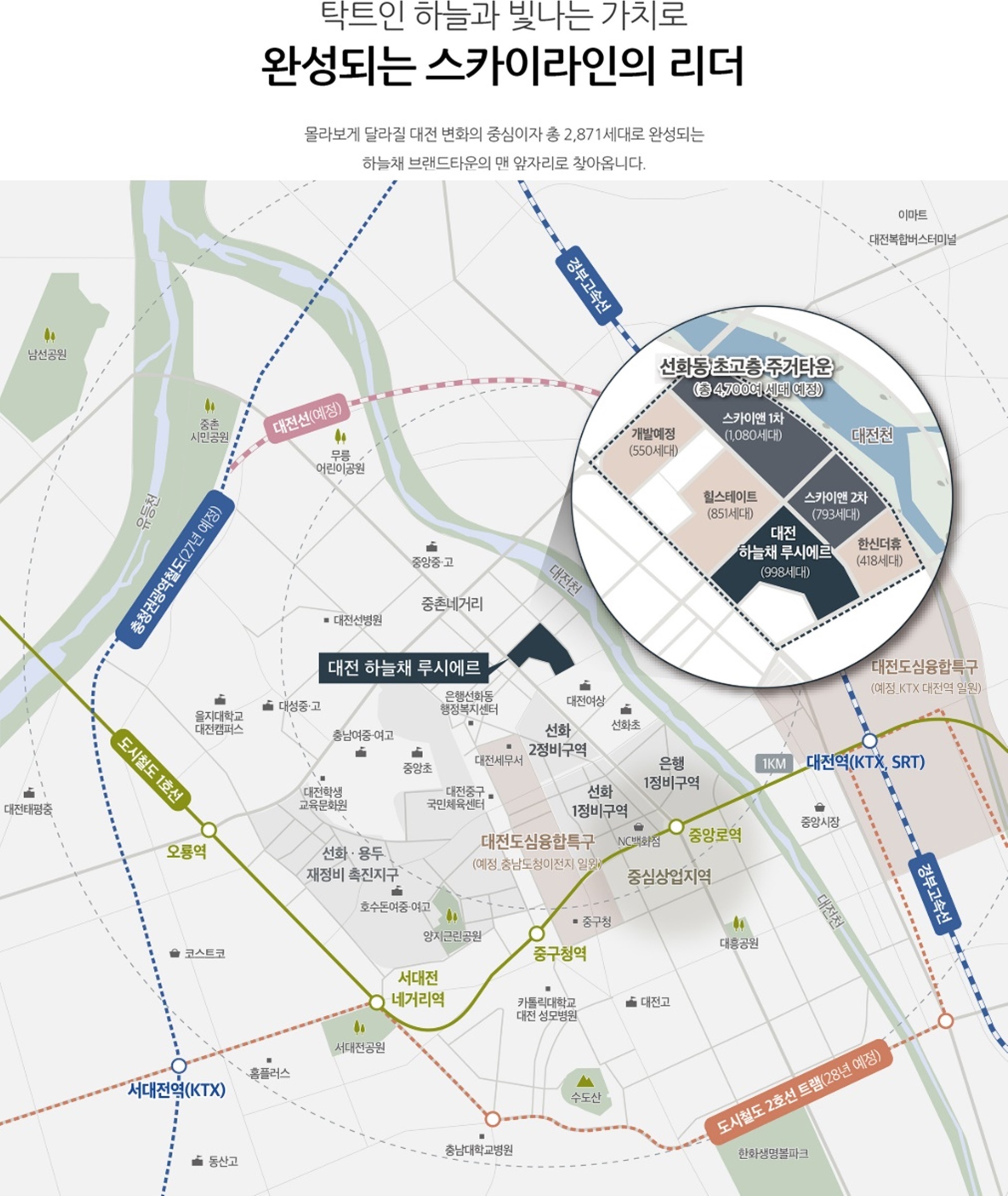 지상 최고 49층, 대전 스카이라인의 리더 총 998세대의 압도적인 규모와 전망을 자랑하는 랜드마크 지상 49층의 초고층으로 설계되어 대전 도심을 조망하는 탁월한 시티뷰를 선사하며 지역의 새로운 상징으로 떠오릅니다. 대전 도심융합특구 개발의 핵심 4,700여 세대 신흥 주거타운의 최선두 입지 대전역세권 개발 및 도심융합특구 조성 사업과 연계되어 판교형 테크노밸리 도심의 미래 가치를 가장 가까이에서 누립니다. 1호선 중앙로역을 품은 쾌속 교통망 충청권 광역철도(예정) 수혜까지 더해지는 더블 역세권 1호선 중앙로역 이용이 편리하며 광역 교통망 확충에 따른 충청권 교통 중심지로서의 역할을 강화합니다. 코오롱글로벌 하늘채의 브랜드 가치 검증된 시공 능력과 체계적인 청정 환경 시스템 코오롱글로벌이 시공을 맡아 신뢰를 더하며, 헤파 필터 전열교환기 등 청정 환경 시스템으로 주거의 질을 높입니다. 선화초, 충남여중고 등 우수 학군 안심 도보 통학 및 명문 학군이 밀집된 교육 환경 선화초, 충남여중·고 등 다채로운 교육 시설이 가까워 도보 10분 이내 안심 학세권을 형성하고 있습니다. 동간거리 100m 확보의 쾌적한 단지 설계 사생활 보호와 개방감을 극대화한 주거 환경 총 6개동의 단지 배치를 통해 최대 동간거리 100m를 확보하여 채광과 통풍, 그리고 주거의 독립성을 보장합니다. 다채로운 테마의 명품 커뮤니티 웰니스 라운지, 바이탈 가든 등 풍부한 시설 푸른 녹지와 조화된 바이탈 가든, 웰니스 라운지 등 입주민의 건강과 여가를 책임지는 특화 시설이 조성됩니다.